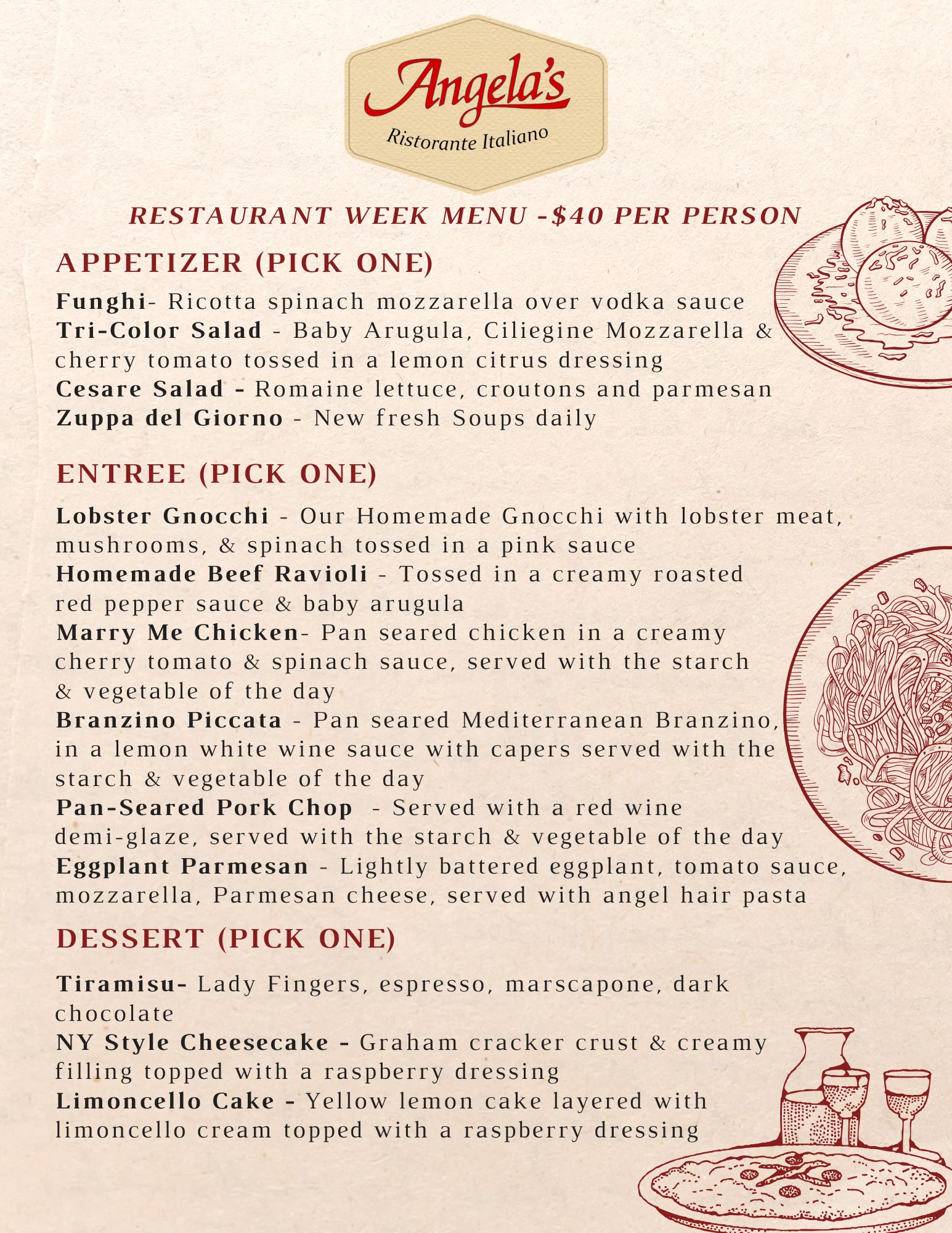 Our restaurant is family-friendly, neighborhood casual atmosphere, perfect for a night out with friends or a special occasion. We believe in fresh food and mouth watering flavors! Hailing from Italy we cook to order and only the best quality ingredients. Join us for a classic Italian dinner with wine, family and friends!
